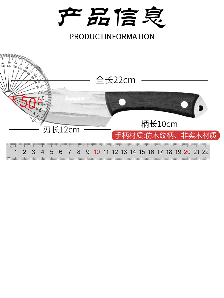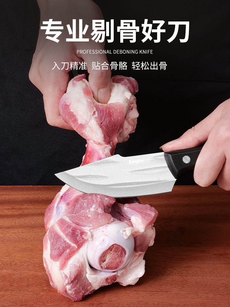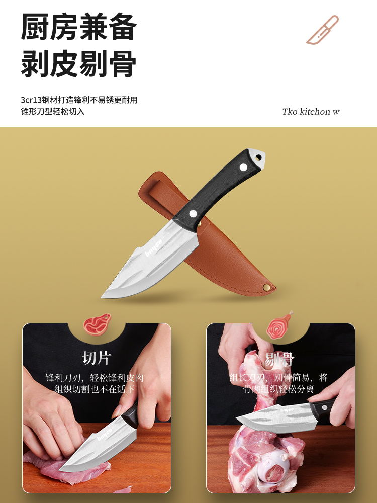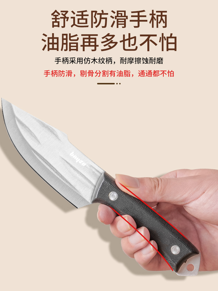 送刀套!入刀jing准,贴合骨骼,轻松出骨,手柄采用仿木纹柄,耐摩擦蚀耐磨,手柄防滑,剔骨分割有油脂,通通都不怕