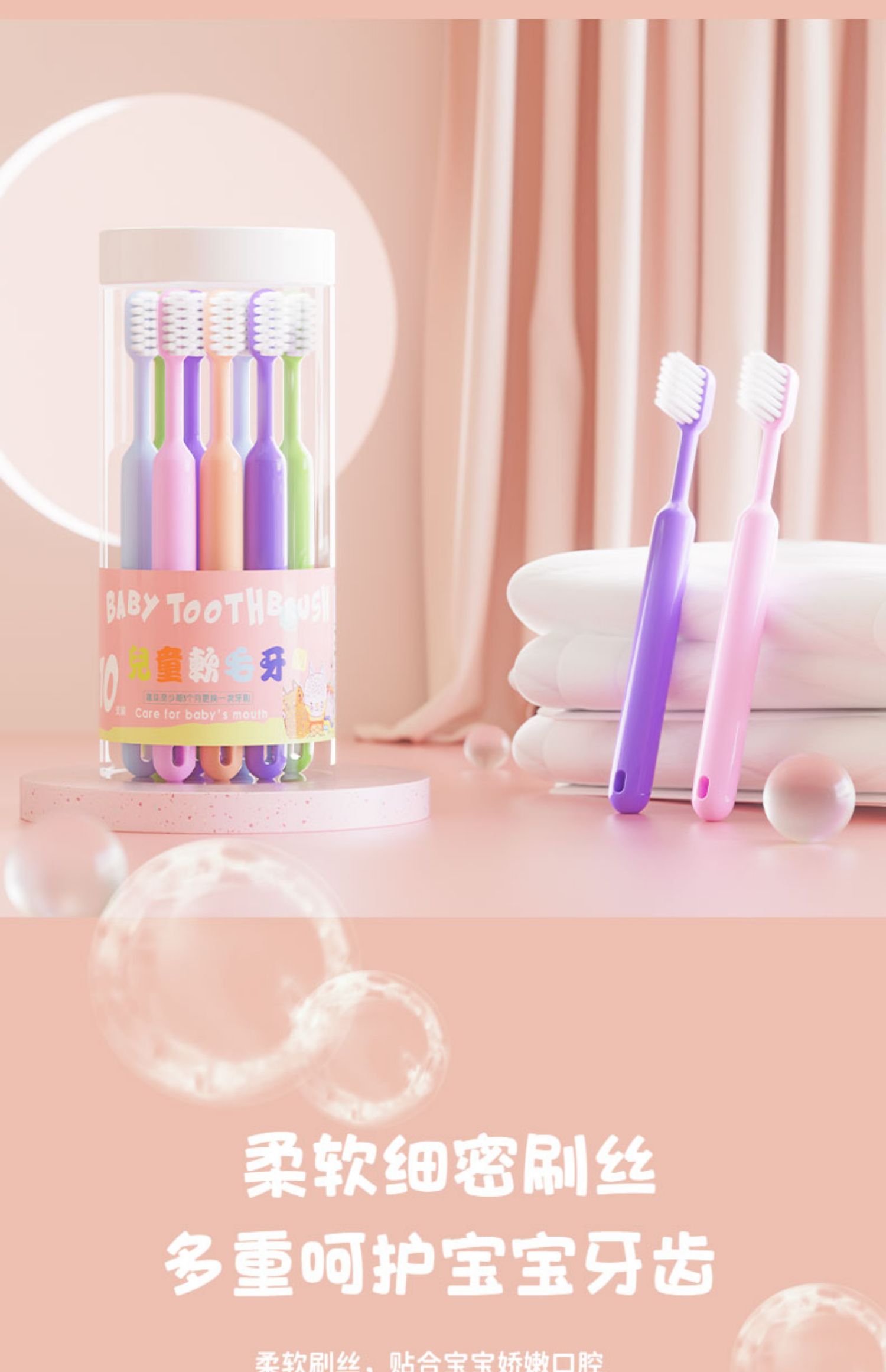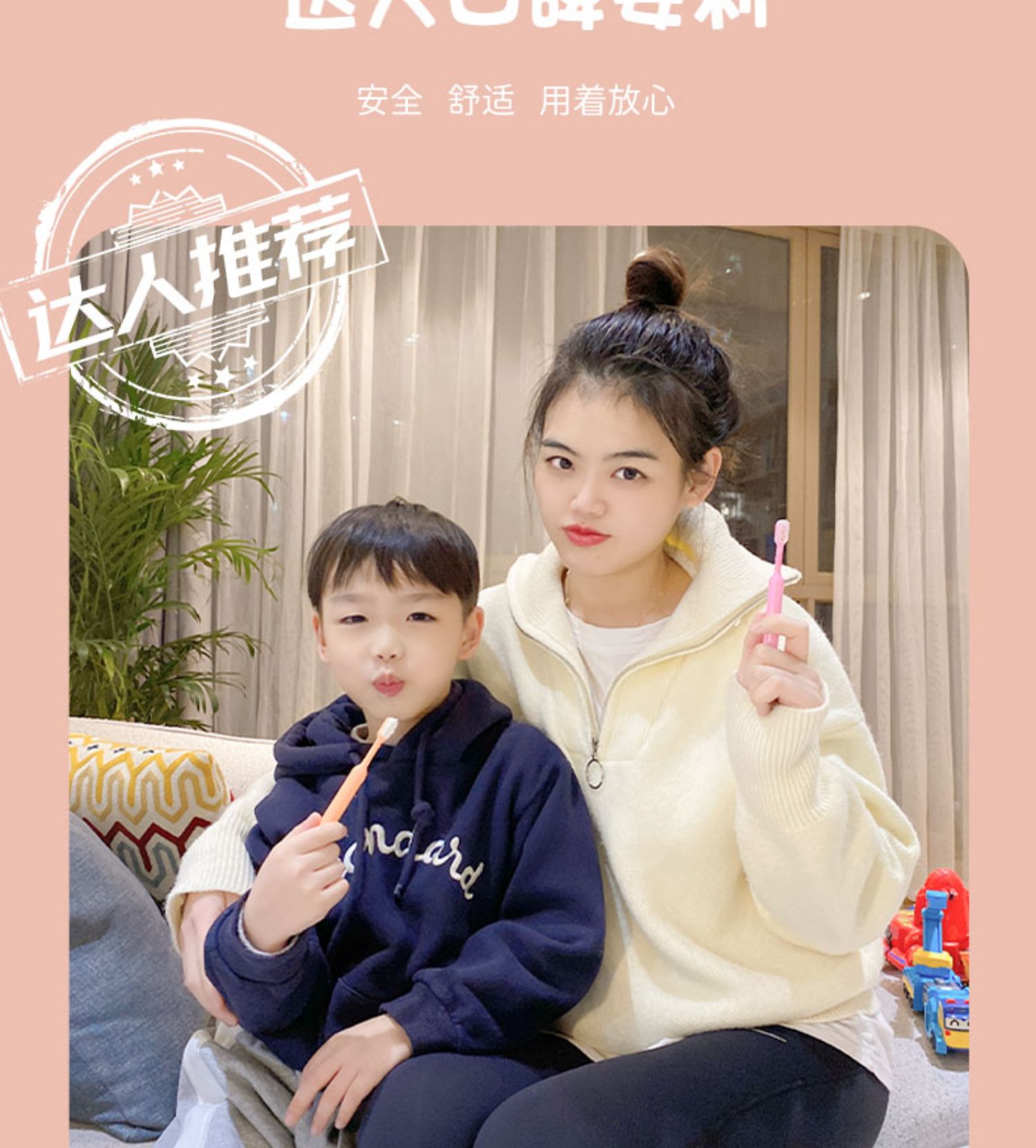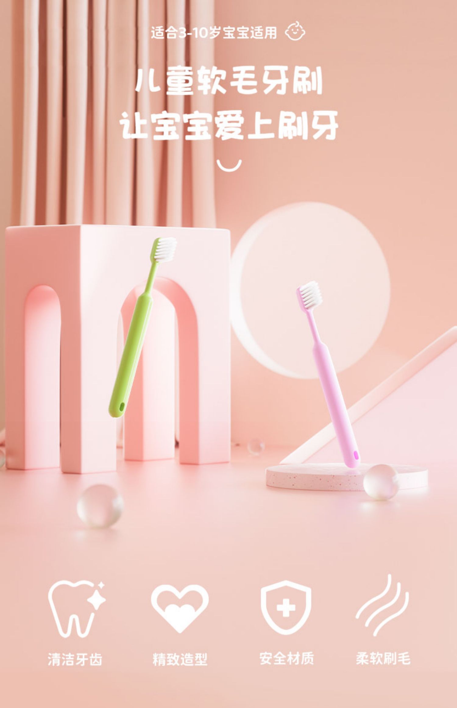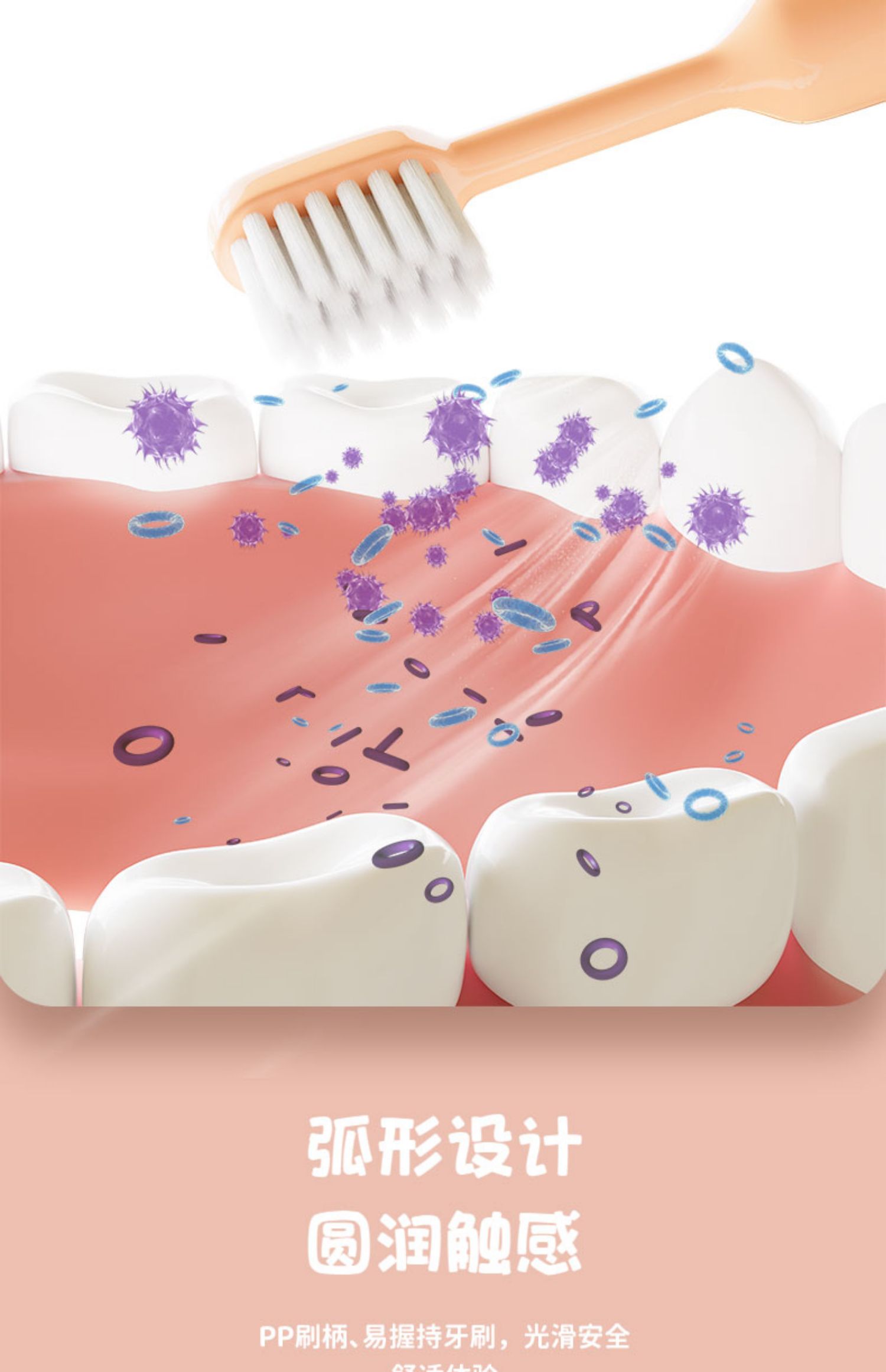 【萌盈】细密柔软刷毛,温柔呵护宝宝牙龈,符合儿童人体工程学设计舒适易握!柔软刷丝,贴合宝宝娇嫩口腔,用心呵护宝宝健康!采用PBT材质软毛,清除宝宝牙齿污垢的同时不会刺伤宝宝牙龈!