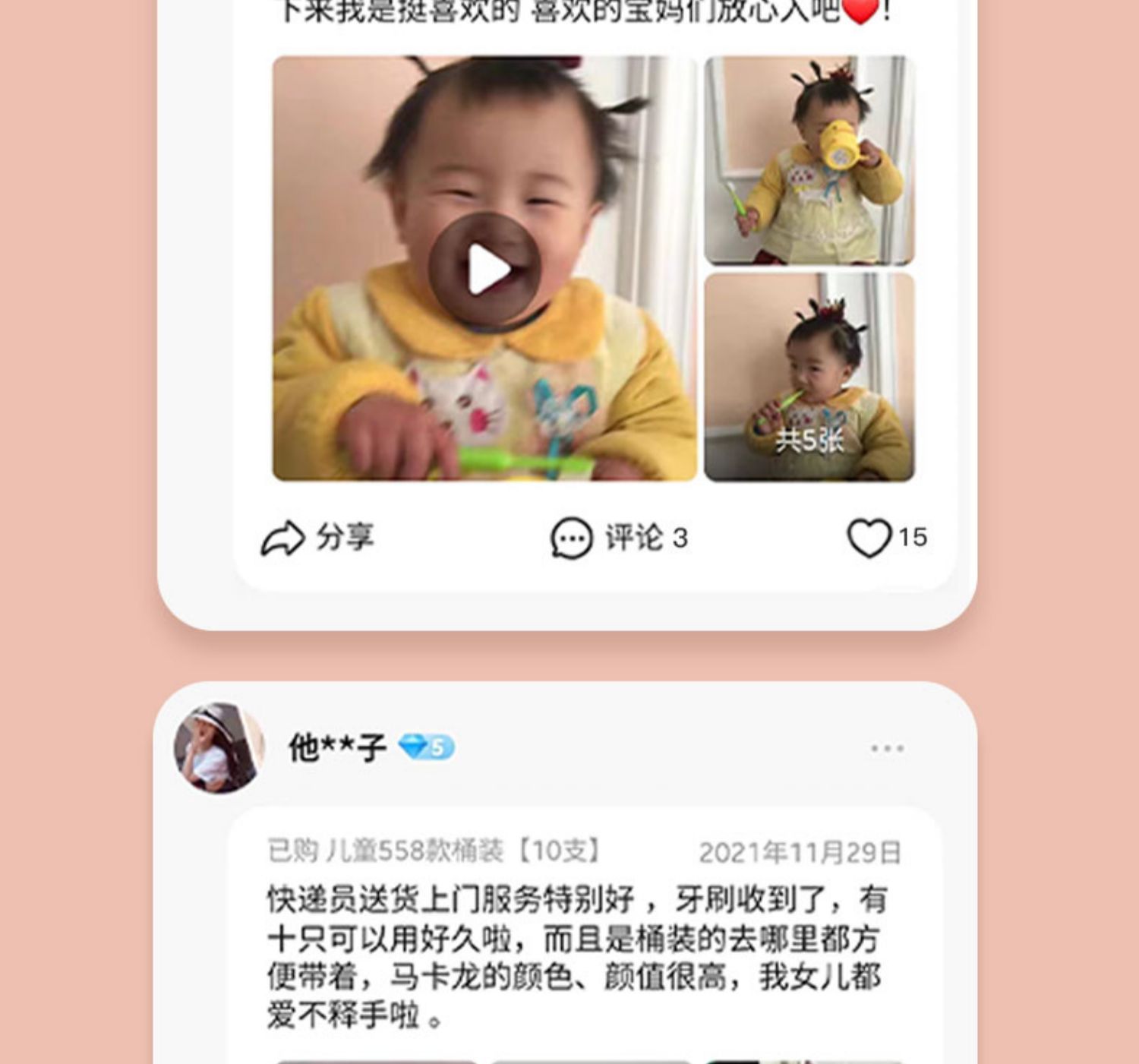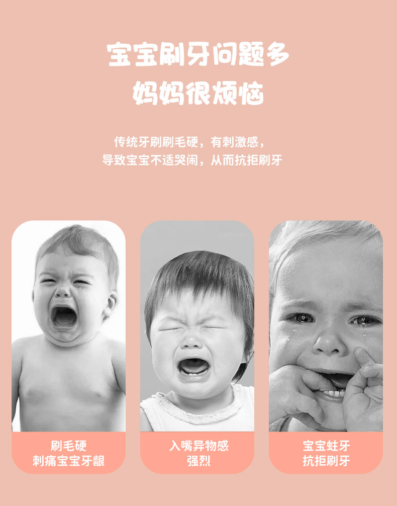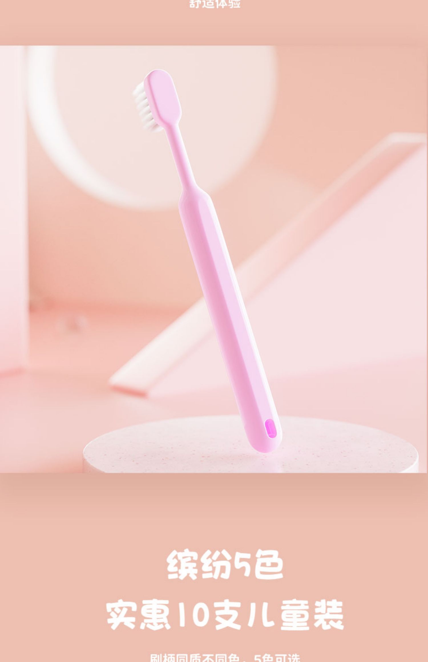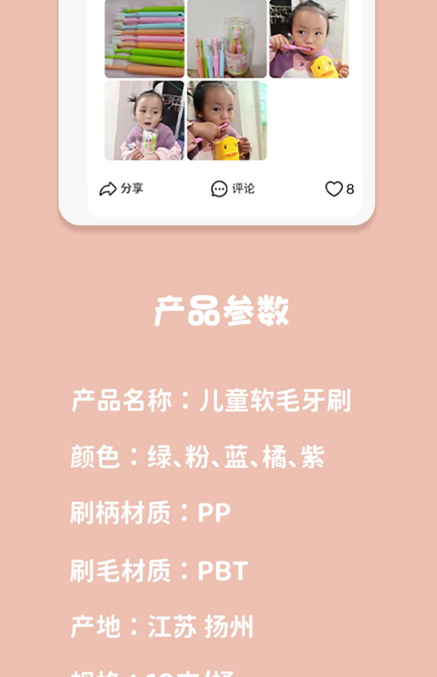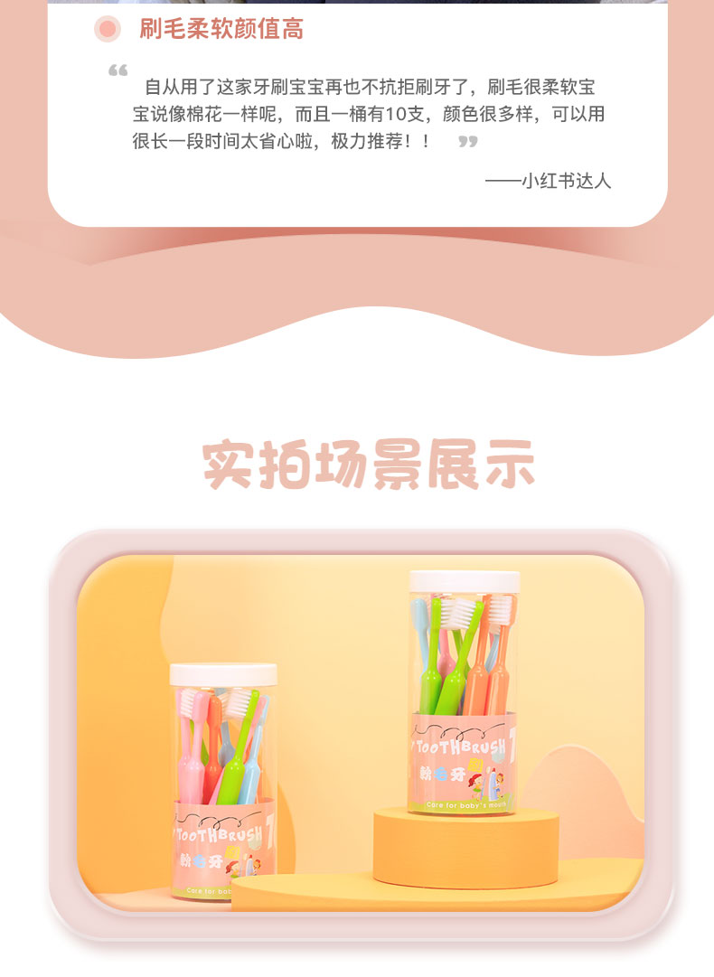 【萌盈】细密柔软刷毛,温柔呵护宝宝牙龈,符合儿童人体工程学设计舒适易握!柔软刷丝,贴合宝宝娇嫩口腔,用心呵护宝宝健康!采用PBT材质软毛,清除宝宝牙齿污垢的同时不会刺伤宝宝牙龈!